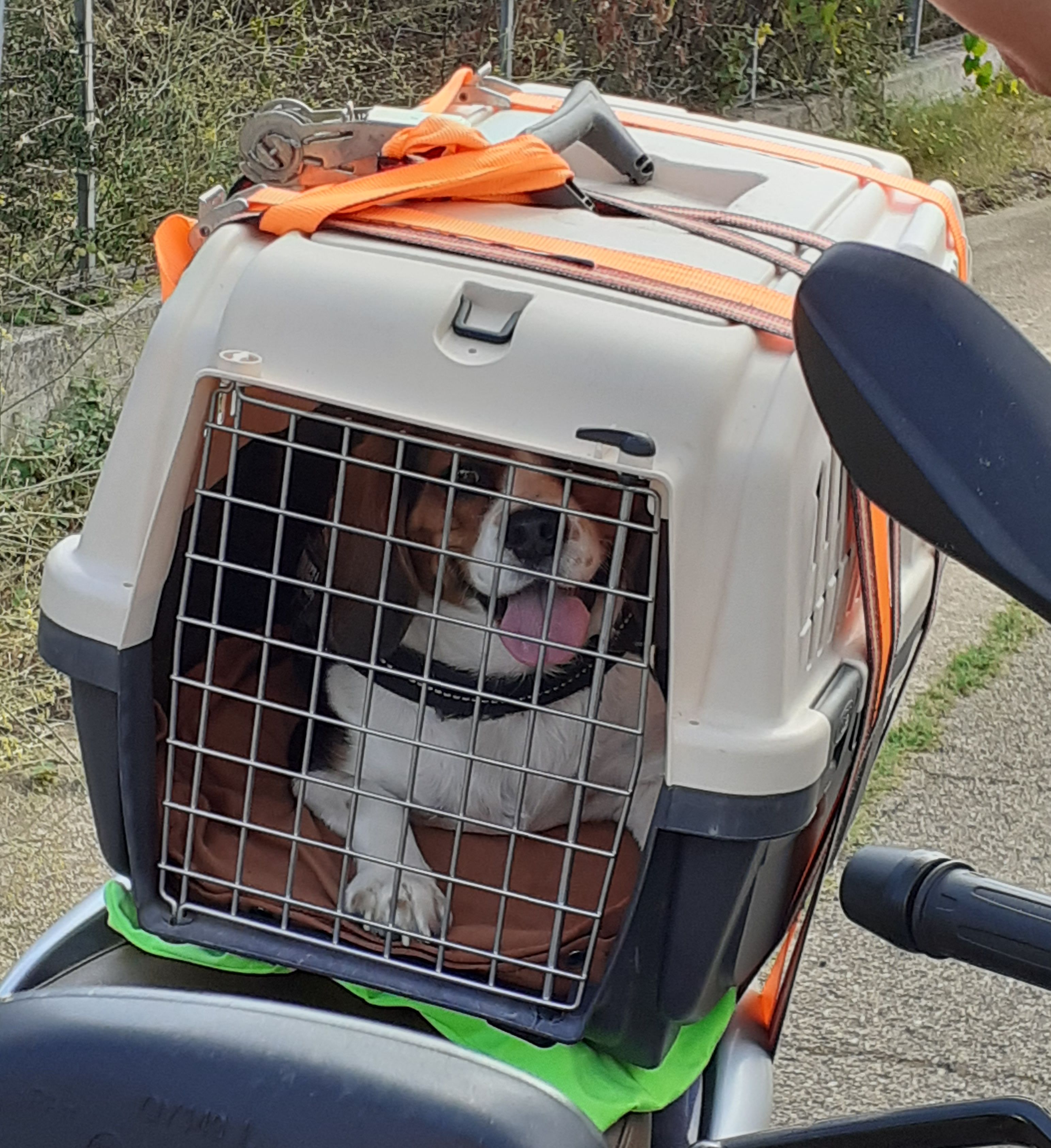 Das Topcase wurde inkl. Platte abgebaut und somit Platz für die Hundebox geschaffen, die vom Soziussitz nach hinten über den Gepäckträger geht. Und, unser Hund geht freiwillig rein und fährt offenbar gerne mit.